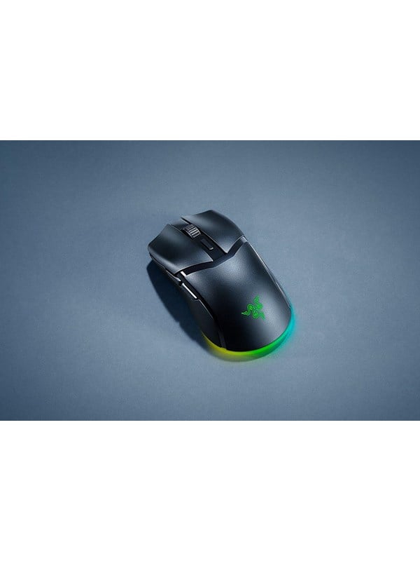 Trådløs gaming mus med RGB, kablet tilslutning: USB-A / USB-C med aftageligt USB-C, trådløs teknologi: 2.4 GHz og Bluetooth x, batteri: genopladelig, batterilevetid (op til): 170 (BT) / 110 (2.4GHz) timer, polling rate: 125 – 1000 Hz opdatering, optisk sensor – Focus X 26K med 100 – 26000 dpi (med justerbar dpi knap), max fart (speed): 500 IPS (inches per second), max acceleration: 40, 7 knapper, scroll hjul, kan bruges af højrehåndet, vægt: 62 gram, kompatibilitet: Windows, Software: Razer Synapse, sort med RGB -PERFECTED FOR PLAY! Immerse freely and fully with the Razer Cobra HyperSpeed – a lightweight, symmetrical wireless gaming mouse. Featuring dynamic 4-zone Chroma lighting, 9 customizable controls, and next-gen optical switches, light up your game and play with no limits.