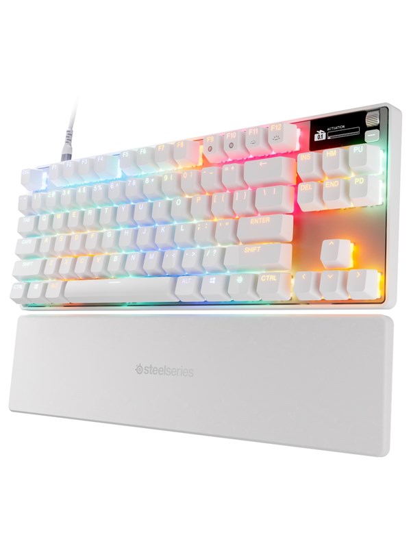 Premium gaming tastatur med RGB, størrelse: TKL-type, PC forbindelse: USB-A, aftageligt tastaturkabel: USB-C, Double-shot PBT keycaps, mekanisk SteelSeries OmniPoint 3.0 Hall Effect linear switche, volume hjul, håndledsstøtte, n-key rollover, kompatibilitet: Windows / MacOS, layout: engelsk (US) QWERTY, x, Software: SteelSeries GG, farve: hvid. – VERDENS HURTIGSTE TASTATUR – Skub grænserne med banebrydende OmniPoint 3.0 justerbare HyperMagnetiske kontakter og nye funktioner OMNIPOINT 3.0 – Mere end blot hurtig, vores nydesignede Hall Effect Switch har 20 gange hurtigere registrering og 11 gange hurtigere reaktionstid med 40 niveauer af justerbar registrering. GG QUICKSET – Spilklare forhåndsindstillinger til dine yndlingsspil; anbefalede registreringsniveauer, hurtig udløser, beskyttelsesindstilling, hurtigt tryk og meget mere med blot et par klik